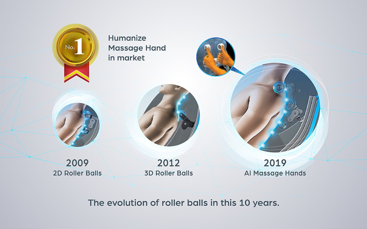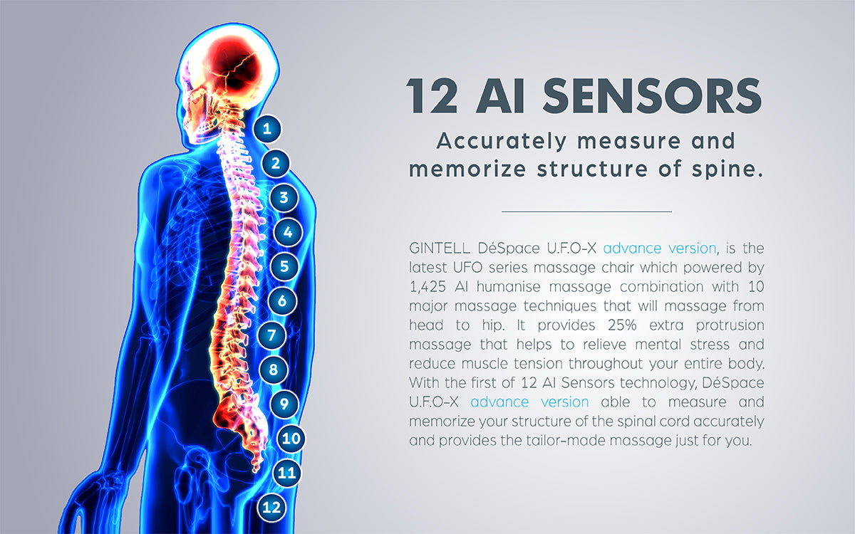 Extra 25% protrusion. Accurately measure and memorize the 12 points of the spine. It enables customizable massage up to 1,425 massage combinations with 10 massage techniques