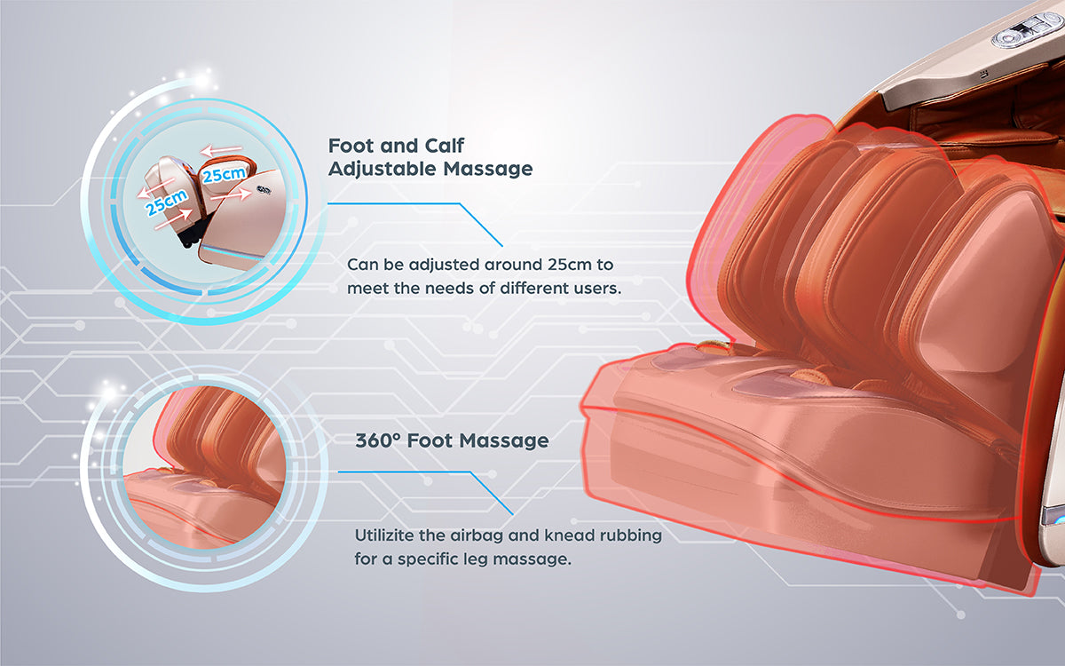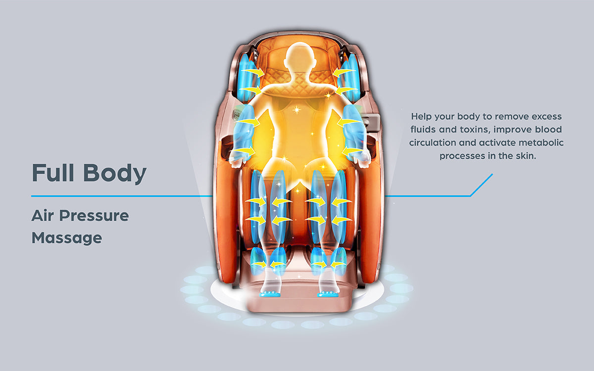 Airbag compression to loosen muscle tension & heaviness. Airbags are located on shoulder, lower back, arms, calves and foot