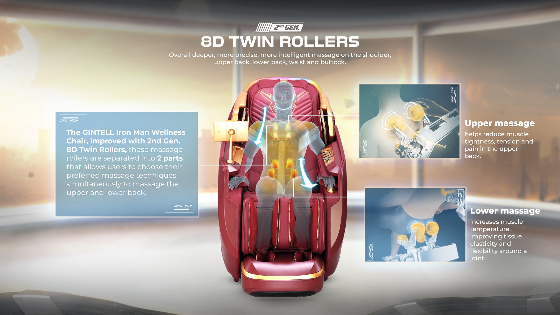 Separated massage rollers allowing users to enjoy a personalized, deeper, precise and intelligent massage that focuses on the shoulders, upper back, lower back, waist and buttocks.