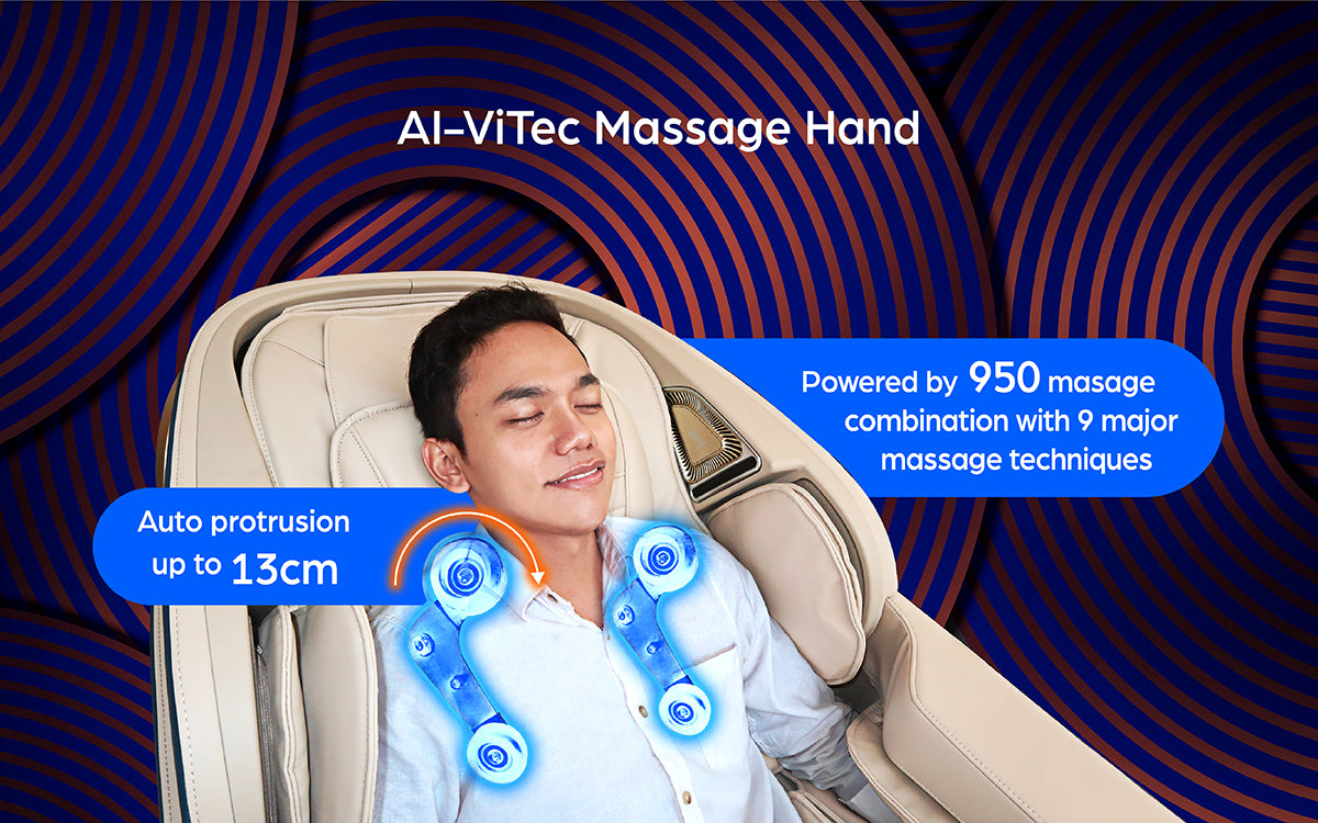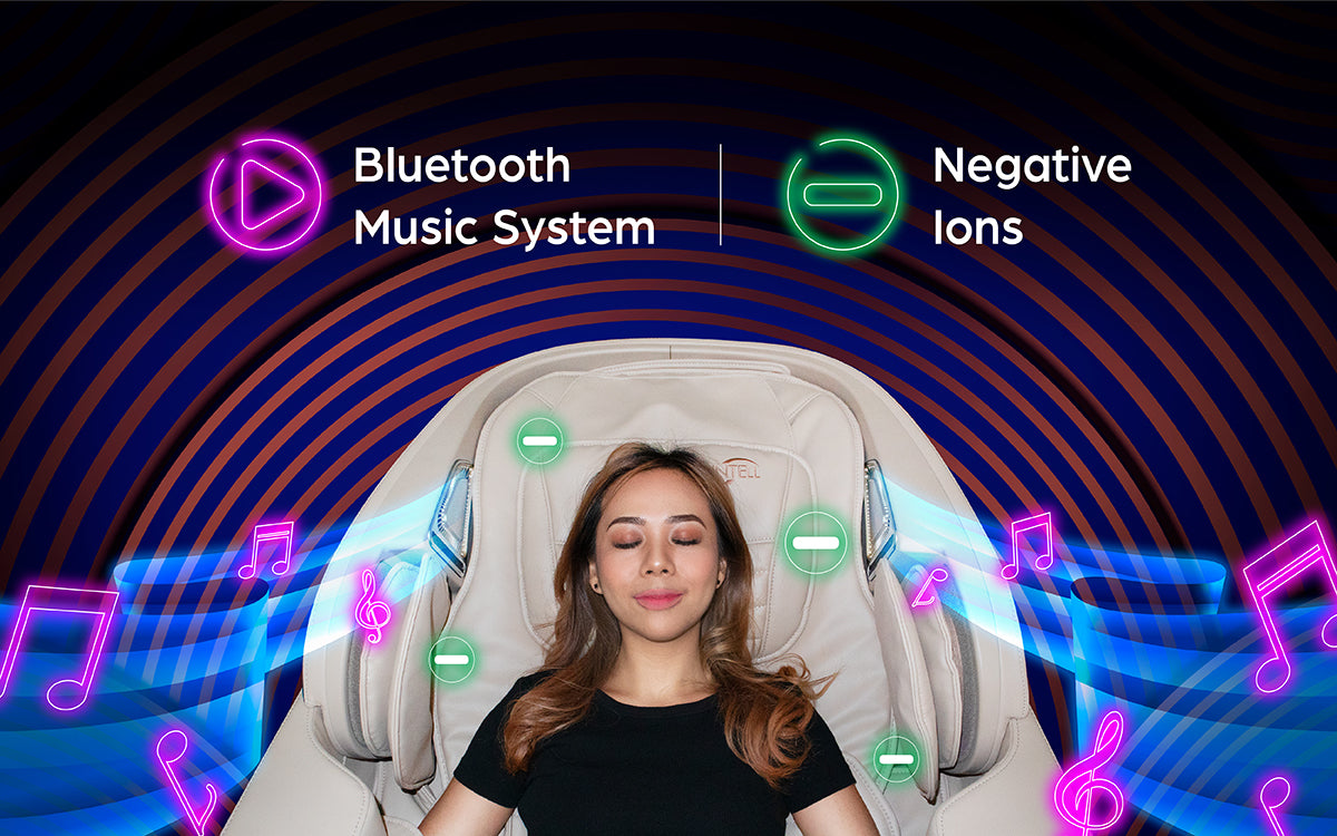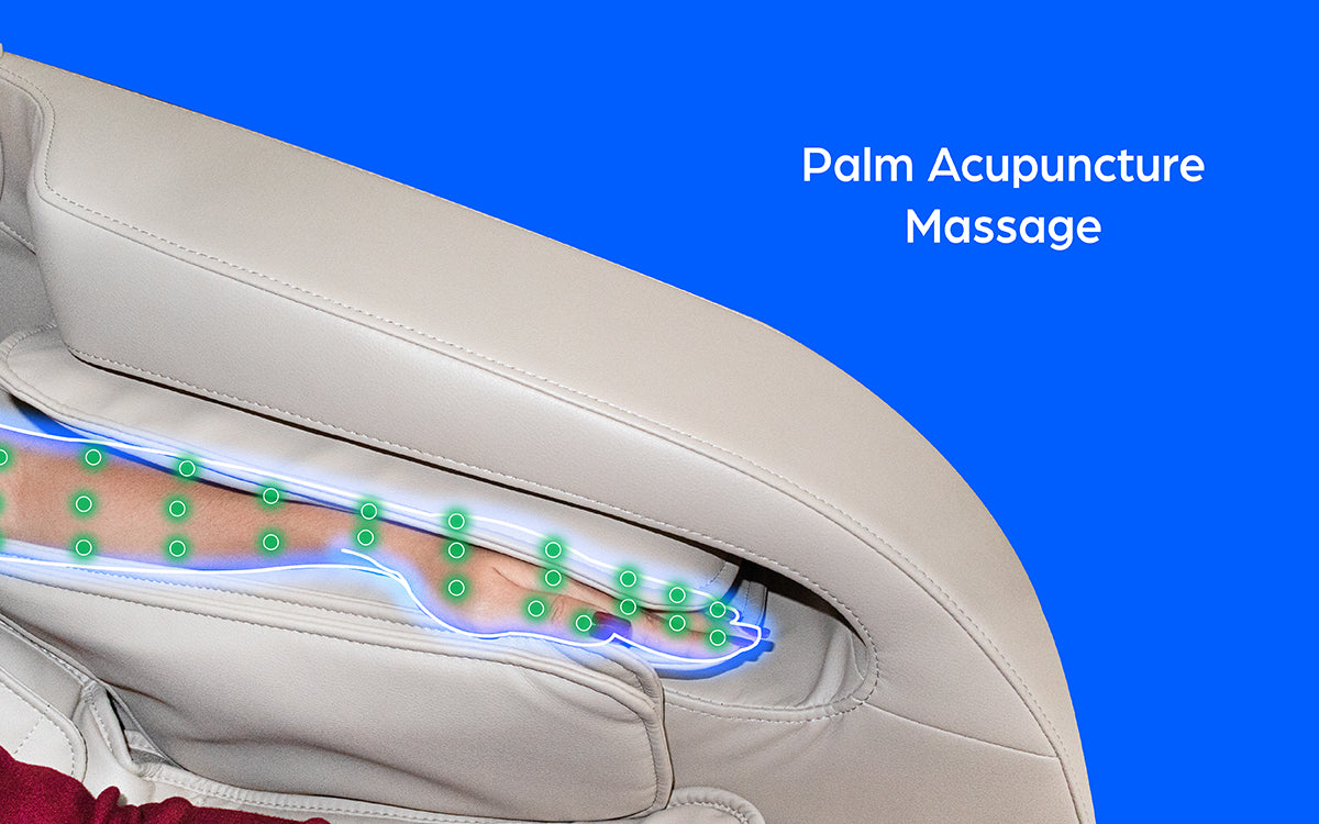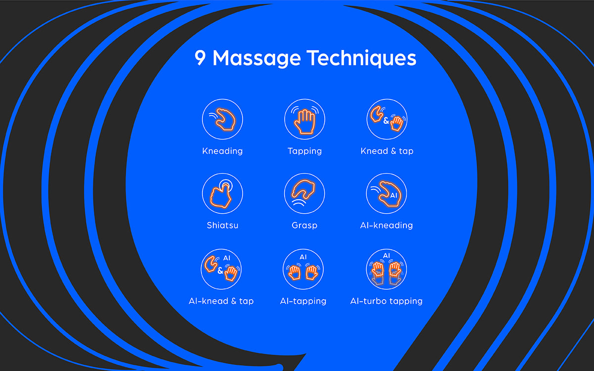 Airbag compression to loosen muscle tension & heaviness. Airbags are located on shoulder, lower back, arms, calves and foot