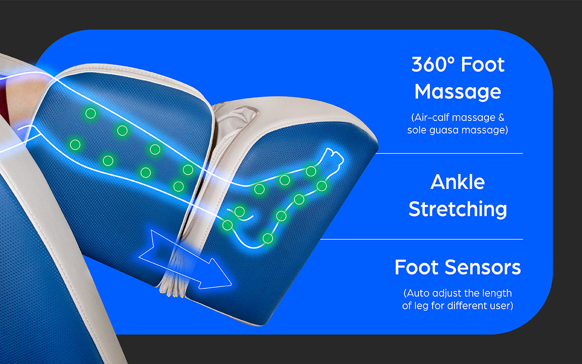 360° air-calf & sole guasa massage. Auto adjust footrest based on user’s height