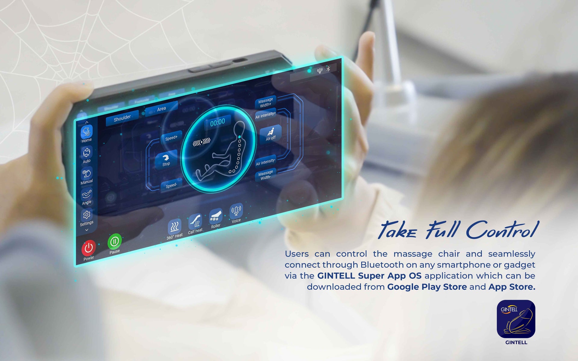 Seamlessly control the massage chair through Bluetooth connectivity. Just download the GINTELL SuperApp OS from Google Play Store or App Store